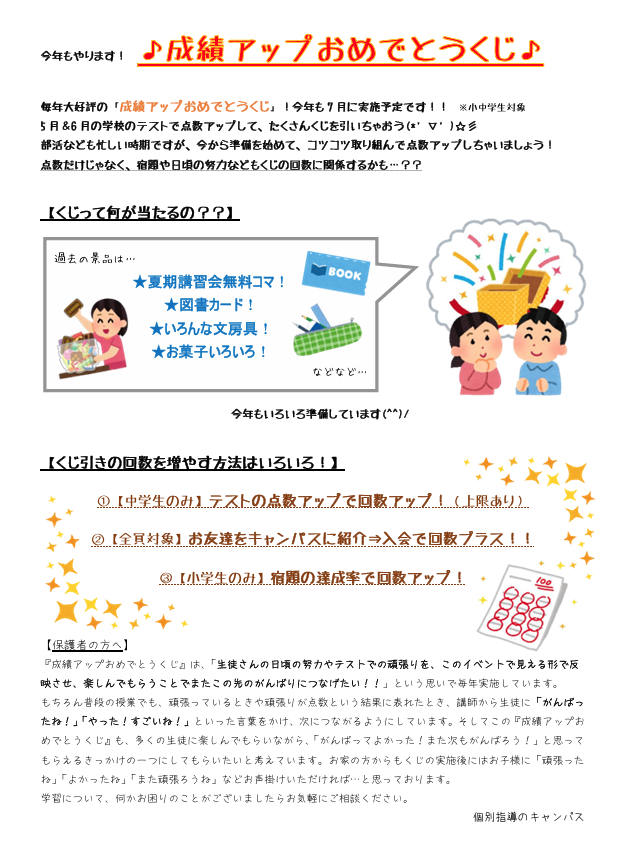 詳しくはコチラです⇒★【成績アップおめでとうくじ】実施のおしらせ★
